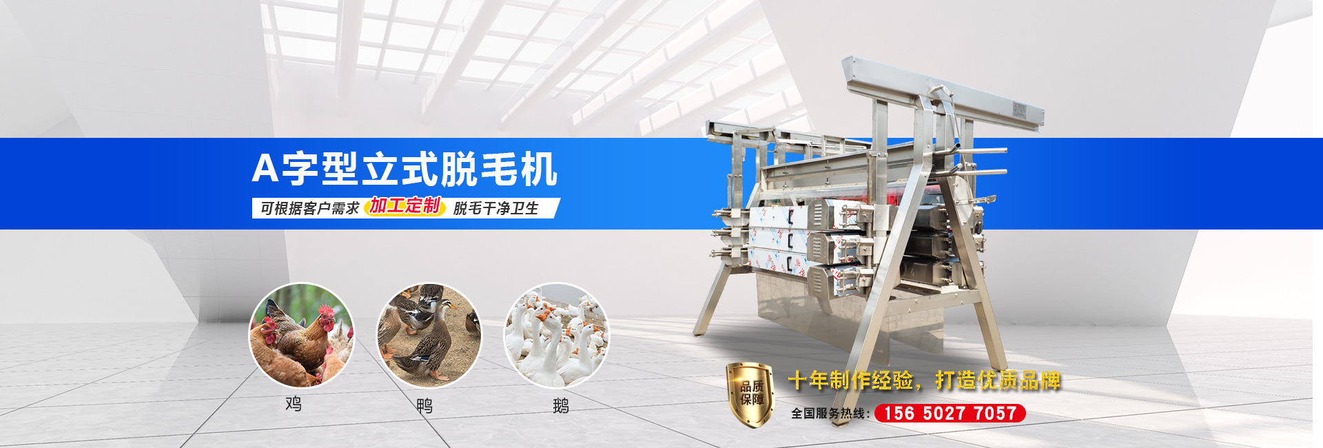 公司主要設備有:A字型立式脫毛機、臥式脫毛機、強力噴淋機、松毛機、浸燙池、螺旋預冷機、禽籠清洗機、電暈機、兔割前爪/后爪機、剝胗機、自動洗鉤機、螺旋燙爪機、雞爪脫皮機、分割輸送帶等屠宰用設備。